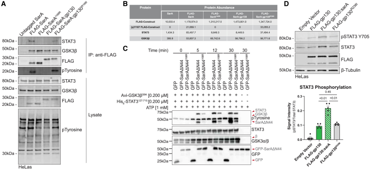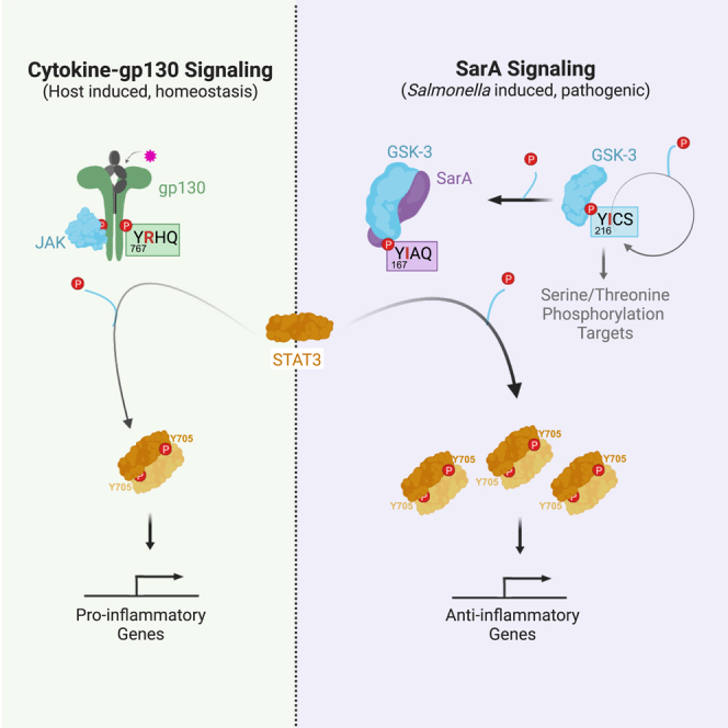 Salmonella causes ∼1 million cases of gastroenteritis annually in the United States. Critical to virulence are secreted effectors that reprogram host functions. We previously discovered the effector SarA facilitates phosphorylation of STAT3, inducing expression of the anti-inflammatory cytokine interleukin-10 (IL-10). This STAT3 activation requires a region of homology with the host cytokine receptor gp130. Here, we demonstrate that a single amino acid difference is critical for the anti-inflammatory bias of SarA-STAT3 signaling. An isoleucine at pY+1 of the YxxQ motif in SarA (which binds the STAT3 SH2 domain) causes increased STAT3 recruitment and phosphorylation, biasing toward anti-inflammatory targets. This isoleucine renders SarA a better substrate for tyrosine phosphorylation by GSK-3. GSK-3 is canonically a serine/threonine kinase that nonetheless undergoes tyrosine autophosphorylation at a motif with isoleucine at the pY+1 position. Our results provide a molecular basis for how a Salmonella effector achieves supraphysiological levels of STAT3 activation to control host genes.
