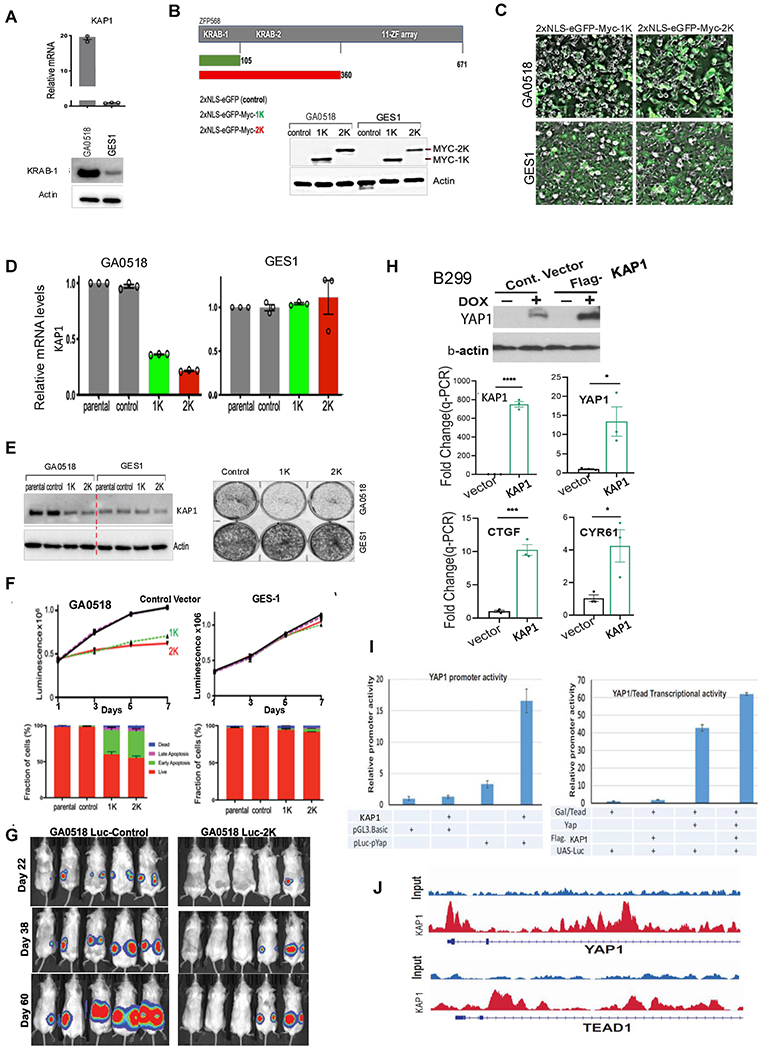 Gastric adenocarcinoma (GAC) remains a significant global health challenge, with over a million new cases annually. Peritoneal carcinomatosis (PC), detected in ∼20 % of cases at diagnosis and ∼45 % later, is uniformly fatal, with limited treatment options. This study investigated the role of KAP1 in GAC progression, focusing on its interaction with YAP1 and cancer stemness traits. Analysis of over 596 primary GACs and 72 PC samples revealed that high nuclear KAP1 expression correlates with poor prognosis. KAP1 knockdown reduced oncogenic activity and stemness traits in GAC cells. Mechanistically, KAP1 positively regulates YAP1 transcription by binding to its promoter and reducing H3K27ac levels. Mass spectrometry identified an interaction between KAP1 and HNRNPAB, further modulating YAP1 signaling. Expression of the KRAB domain of ZFP568 without its DNA-binding zinc fingers inhibited both KAP1 and YAP1 expression, significantly reducing colony formation and tumor growth in vivo. Additionally, emerging antisense oligonucleotides (ASOs) targeting KAP1 or YAP1 effectively suppressed mouse tumor progression. These findings establish KAP1 as a critical driver of tumor progression in GAC through YAP1 regulation and HNRNPAB interaction, highlighting its potential therapeutic target. This study advances our understanding and offers a preclinical framework to improve outcomes for GAC.
