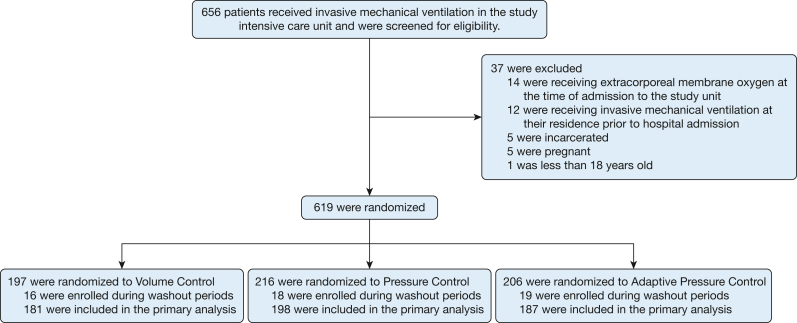 Study design and methods: We conducted a pragmatic, cluster-randomized, crossover pilot trial among adults receiving invasive mechanical ventilation in a medical ICU between November 1, 2022, and July 31, 2023. Each month, patients in the participating unit were assigned to receive volume control, pressure control, or adaptive pressure control during continuous mandatory ventilation. The primary outcome was ventilator-free days through 28 days.