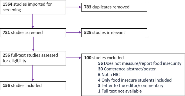 Purpose of review: Food insecurity has recently emerged as a growing problem among students attending post-secondary institutions in high income countries, where it is associated with poorer health outcomes and poorer academic performance. The aim of this systematic literature review and meta-analysis is to synthesize evidence from published studies describing the prevalence of food insecurity among students in post-secondary educational institutions. A broad search was employed to identify any studies related to food security among post-secondary students in high income countries (PROSPERO identifier: CRD42023468944). Four electronic databases were systematically searched: Medline, CINAHL, Global Health, and Embase, in November 2023. Key thematic areas searched were food insecurity and education; no temporal limitations were placed on the search. Only English language peer-reviewed articles were considered. Four authors independently reviewed all articles to identify relevant studies.