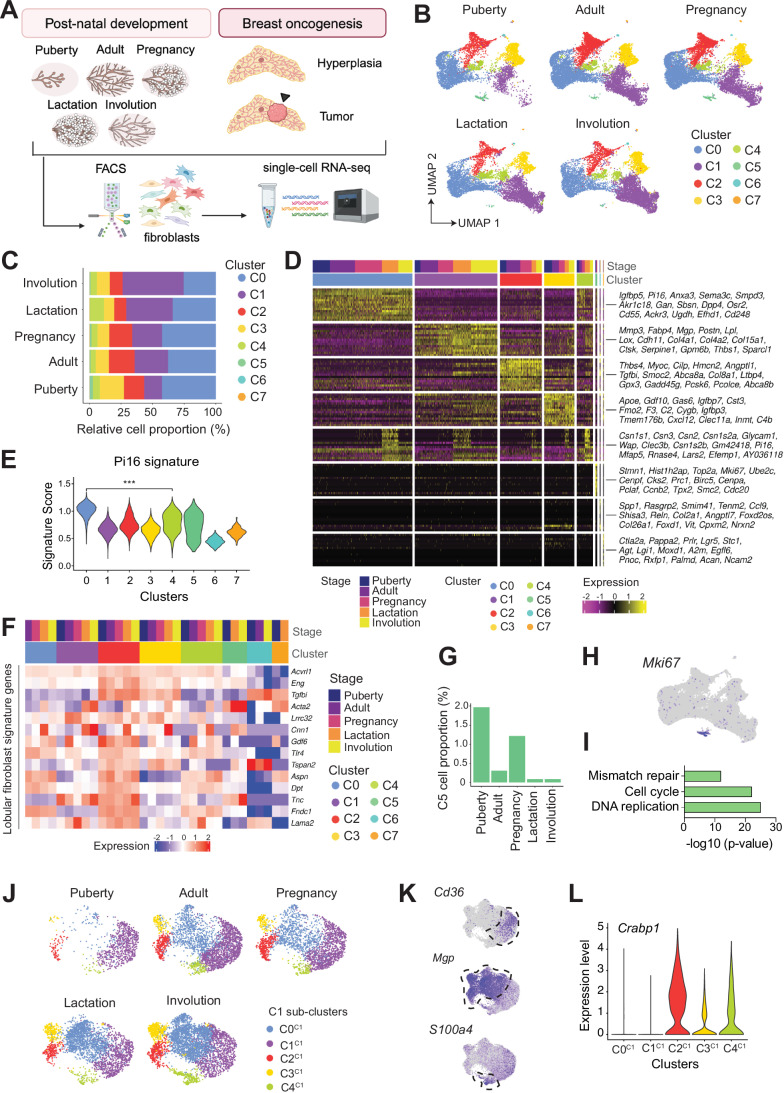 Fibroblasts form a major component of the stroma in normal mammary tissue and breast tumors. Here, we have applied longitudinal single-cell transcriptome profiling of >45,000 fibroblasts in the mouse mammary gland across five different developmental stages and during oncogenesis. In the normal gland, diverse stromal populations were resolved, including lobular-like fibroblasts, committed preadipocytes and adipogenesis-regulatory, as well as cycling fibroblasts in puberty and pregnancy. These specialized cell types appear to emerge from CD34high mesenchymal progenitor cells, accompanied by elevated Hedgehog signaling. During late tumorigenesis, heterogeneous cancer-associated fibroblasts (CAFs) were identified in mouse models of breast cancer, including a population of CD34- myofibroblastic CAFs (myCAFs) that were transcriptionally and phenotypically similar to senescent CAFs. Moreover, Wnt9a was demonstrated to be a regulator of senescence in CD34- myCAFs. These findings reflect a diverse and hierarchically organized stromal compartment in the normal mammary gland that provides a framework to better understand fibroblasts in normal and cancerous states.