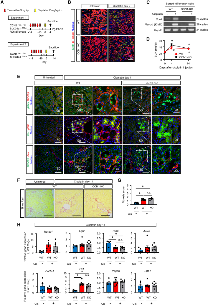 Humoral factors that prompt fibroblasts to migrate to an injury site at an appropriate time point are deemed indispensable for repair after kidney injury. We herein demonstrated the pivotal roles of injured tubule-derived cellular communication network factor 1 (CCN1) in the mobilization of fibroblasts to the injury site after kidney injury. Based on analyses of ligand-receptor interactions in vitro and tubular epithelial-specific transcriptomics in vivo, we identified the up-regulation of CCN1 during the early phases of kidney injury. CCN1 promotes fibroblast chemotaxis through focal adhesion kinase-extracellular signal-regulated kinase (ERK) signaling. In vivo analyses utilizing tubular-specific CCN1 knockout (KO) mice demonstrated the sparse accumulation of fibroblasts around injured sites after injury, resulting in ameliorated tissue fibrosis in CCN1-KO mice. These results reveal an epithelial-fibroblast CCN1 signaling axis that mobilizes fibroblasts to injured tubule early after acute injury but that promotes interstitial fibrosis at late time points.