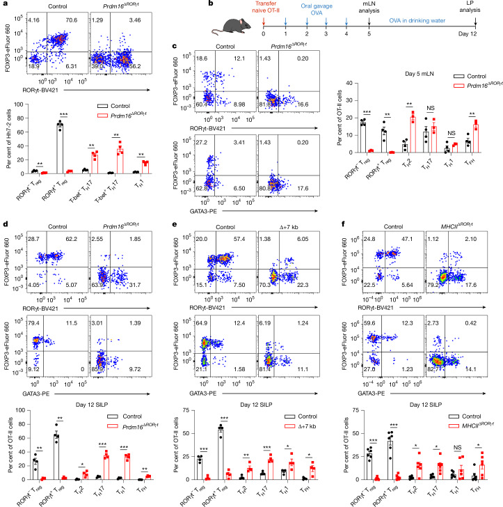 The gastrointestinal tract is continuously exposed to foreign antigens in food and commensal microorganisms with potential to induce adaptive immune responses. Peripherally induced T regulatory (pTreg) cells are essential for mitigating inflammatory responses to these agents1-4. Although RORγt+ antigen-presenting cells (APCs) have been shown to programme gut microbiota-specific pTreg cells5-7, their definition remains incomplete, and the APC responsible for food tolerance has remained unknown. Here we identify an APC subset that is required for differentiation of both food- and microbiota-specific pTreg cells and for establishment of oral tolerance. Development and function of these APCs require expression of the transcription factors PRDM16 and RORγt, as well as a unique Rorc(t) cis-regulatory element. Gene expression, chromatin accessibility, and surface marker analysis establish the pTreg-inducing APCs as myeloid in origin, distinct from type 3 innate lymphoid cells, and sharing epigenetic profiles with classical dendritic cells, and designate them PRDM16+RORγt+ tolerizing dendritic cells (tolDCs). Upon genetic perturbation of tolDCs, we observe a substantial increase in food antigen-specific T helper 2 cells in lieu of pTreg cells, leading to compromised tolerance in mouse models of asthma and food allergy. Single-cell analyses of freshly resected mesenteric lymph nodes from a human organ donor, as well as multiple specimens of human intestine and tonsil, reveal candidate tolDCs with co-expression of PRDM16 and RORC and an extensive transcriptome shared with tolDCs from mice, highlighting an evolutionarily conserved role across species. Our findings suggest that a better understanding of how tolDCs develop and how they regulate T cell responses to food and microbial antigens could offer new insights into developing therapeutic strategies for autoimmune and allergic diseases as well as organ transplant tolerance.