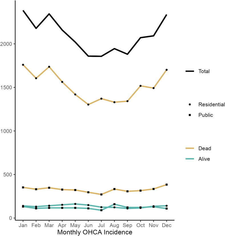 Conclusion: Incidence of OHCA was higher in winter, but rates of bystander CPR and PAD shock remained consistent across seasons. Crude mortality rates were significantly lower during winter. However, multivariable regression analysis revealed no significant variation in survival rates by month.