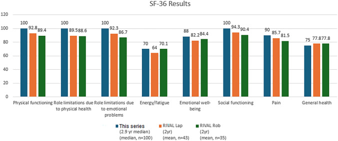 To evaluate the long-term efficacy and health-related quality-of-life (HRQoL) outcomes in patients who underwent robotic-assisted transabdominal preperitoneal (R-TAPP) inguinal hernioplasty in an Australian setting. A cross-sectional analysis of patients who underwent R-TAPP inguinal hernioplasty was performed. Health-related quality of life was assessed using the SF-36 questionnaire. Post-operative outcomes, including chronic pain, opioid requirements, hernia recurrence, and return to activities, were evaluated. A total of 100 patients who completed the SF-36 questionnaire (94 males, 6 females) were included in the study. The median age at operation was 64 years. Of the 77 patients who answered the question on opioid use, 56% used opioids (8% for less than 1 week, 19% for 1 week, 17% for between 1 and 2 weeks, and 9% for more than 2 weeks). Eighty-five percent reported no chronic groin pain at follow-up. The hernia recurrence rate was 1%. The median follow-up period was 35 months. The median time to return to work, driving, and exercise was 1, 2, and 4 weeks, respectively. SF-36 scores showed optimal outcomes (median 100) in physical functioning, role limitations, and social functioning domains. R-TAPP inguinal hernioplasty demonstrates excellent long-term outcomes with high health-related quality-of-life (HRQoL) scores, low chronic pain rates, and minimal recurrence rates. There is the potential for increasing uptake of this procedure with increasing availability and decreasing cost of robotic surgery technology.