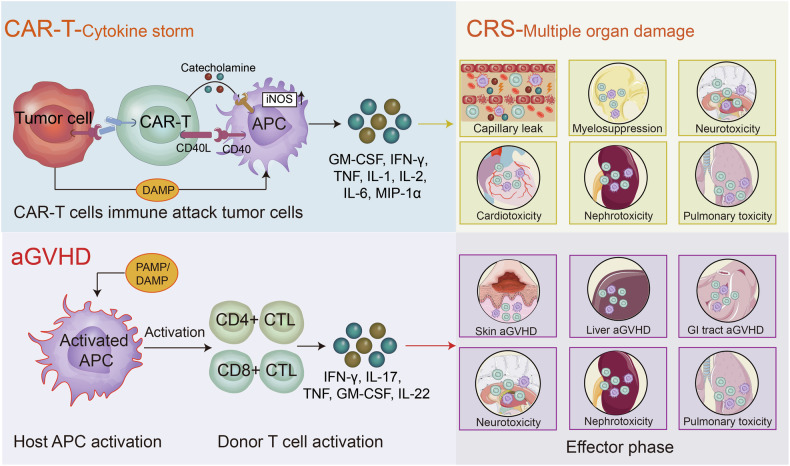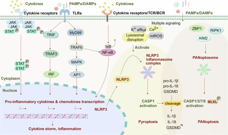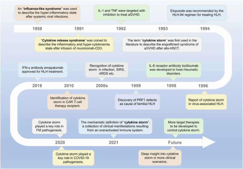 Cytokine storm (CS) is a severe systemic inflammatory syndrome characterized by the excessive activation of immune cells and a significant increase in circulating levels of cytokines. This pathological process is implicated in the development of life-threatening conditions such as fulminant myocarditis (FM), acute respiratory distress syndrome (ARDS), primary or secondary hemophagocytic lymphohistiocytosis (HLH), cytokine release syndrome (CRS) associated with chimeric antigen receptor-modified T (CAR-T) therapy, and grade III to IV acute graft-versus-host disease following allogeneic hematopoietic stem cell transplantation. The significant involvement of the JAK-STAT pathway, Toll-like receptors, neutrophil extracellular traps, NLRP3 inflammasome, and other signaling pathways has been recognized in the pathogenesis of CS. Therapies targeting these pathways have been developed or are currently being investigated. While novel drugs have demonstrated promising therapeutic efficacy in mitigating CS, the overall mortality rate of CS resulting from underlying diseases remains high. In the clinical setting, the management of CS typically necessitates a multidisciplinary team strategy encompassing the removal of abnormal inflammatory or immune system activation, the preservation of vital organ function, the treatment of the underlying disease, and the provision of life supportive therapy. This review provides a comprehensive overview of the key signaling pathways and associated cytokines implicated in CS, elucidates the impact of dysregulated immune cell activation, and delineates the resultant organ injury associated with CS. In addition, we offer insights and current literature on the management of CS in cases of FM, ARDS, systemic inflammatory response syndrome, treatment-induced CRS, HLH, and other related conditions.