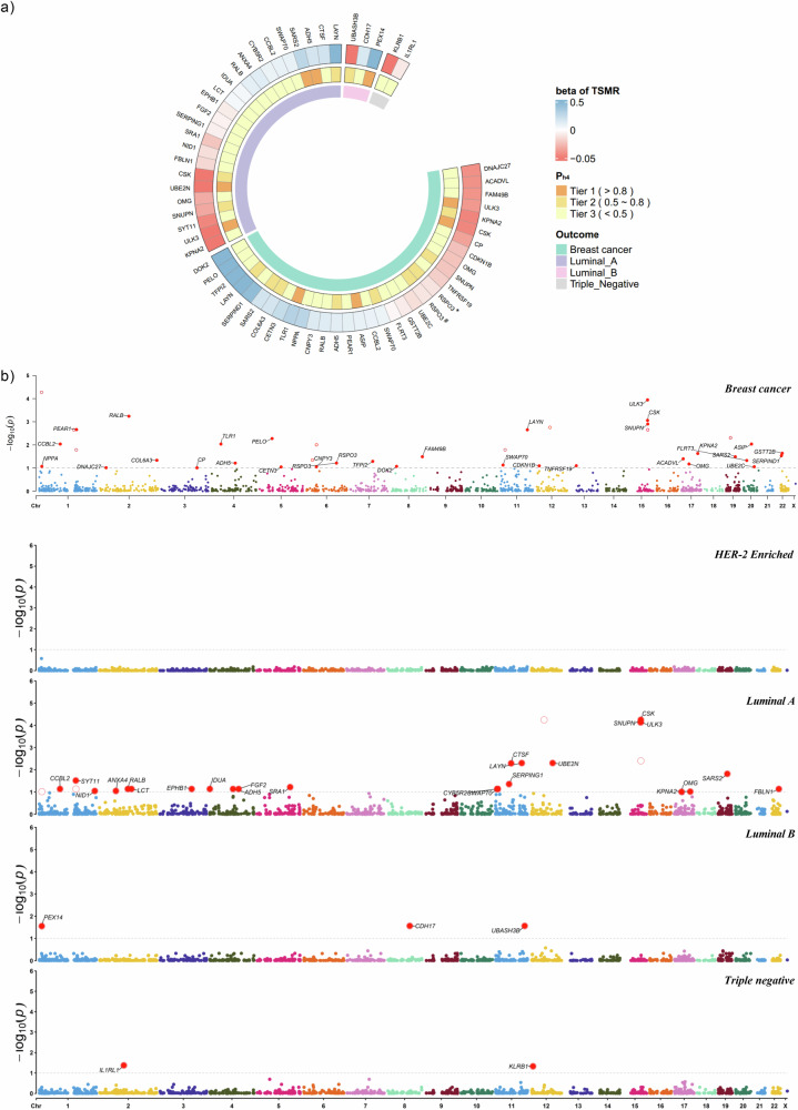 To address the pressing need to improve breast cancer outcomes, we identify 9 plasma proteins with significant associations to breast cancer, namely ULK3, CSK, ASIP, TLR1 in breast cancer, ADH5, SARS2, ULK3, UBE2N in Luminal A subtype, PEX14 in Luminal B subtype. Tumor immune cell infiltration analysis and mutation phenotypes in mice further demonstrate a complex pattern of interaction between these genes and immune responses. Compared to normal tissues, tumor tissues exhibit reduced expression of ULK3 and CSK. Notably, elevated ULK3 expression in both breast cancer and the Luminal A subtype is significantly associated with prolonged recurrence-free survival. Overexpression of CSK and ULK3 is confirmed to significantly inhibit the proliferation and migratory ability of MCF-7 cells. Additionally, three drug candidates-TG100801, Hydrochlorothiazide, and Imatinib-show promise in targeting these proteins, contributing valuable insights for prioritizing drug development in realm of breast cancer.
