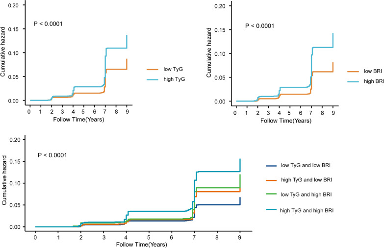Results: Among 6621 participants aged 45 years or older, the mean (SD) age was 58.06 (8.57) years, with 2951 (44.6%) being male. During a follow-up period of up to 9 years, 743 individuals experienced stroke events. Compared to participants with low TyG index and low BRI, the adjusted hazard ratios (HRs) were as follows: 1.36 (95% confidence interval [CI] 1.05-1.75) for high TyG index alone, 1.61 (95% CI 1.27-2.05) for high BRI alone, and 1.78 (95% CI 1.40-2.26) for high TyG index and high BRI. Neither additive nor multiplicative interactions between BRI and TyG for incident stroke were statistically significant. The combination of TyG and BRI enhanced the predictive capability for stroke compared to either biomarker alone.