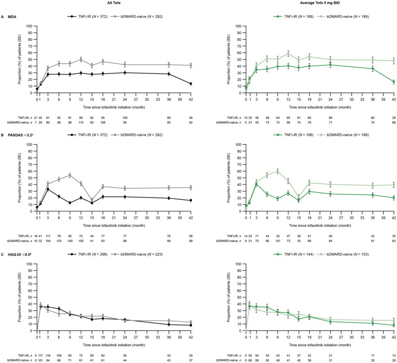 Results: A total of 408 TNFi-IR patients (including 29 TNFi-experienced with unknown IR status) and 562 bDMARD-naïve patients were included. At baseline, TNFi-IR patients were more likely to be ≥65 years old, have cardiovascular/venous thromboembolism risk and have longer disease duration vs bDMARD-naïve patients. Drug survival was numerically shorter in TNFi-IR vs bDMARD-naïve patients. Tofacitinib efficacy was generally sustained to month 42, regardless of prior bDMARD treatment. Minimal disease activity/ PsA Disease Activity Score ≤3.2/>75% Psoriasis Area and Severity Index improvement response rates were numerically lower in TNFi-IR vs bDMARD-naïve patients to month 42, but rates of achieving an HAQ Disability Index ≤0.5 and enthesitis/dactylitis resolution were similar. In TNFi-IR vs bDMARD-naïve patients, treatment-emergent adverse event incidence rates were higher and serious adverse event, serious infection and herpes zoster incidence rates were numerically higher (CI overlapped).
