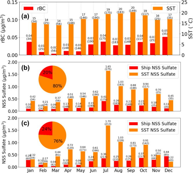 Aerosol nonsea-salt sulfate (NSS sulfate) forms in the atmosphere by secondary reactions of emissions from marine phytoplankton and shipping, with gas-phase as well as cloud and aerosol aqueous reactions controlling production. Twelve months of Atmospheric Radiation Measurements (ARM) during the Eastern Pacific Cloud Aerosol Precipitation Experiment (EPCAPE) at Scripps Pier in La Jolla, California, showed the highest NSS sulfate mass concentrations occurred for the northwesterly back-trajectories over 64% of the year, with an average of 0.90 μg/m3 that contributed 76% of annual NSS sulfate concentration. Multiple Linear Regression (MLR) and a refractory black carbon tracer method attributed 76-80% of the regionally emitted sulfur dioxide (SO2) sources of submicron NSS sulfate to marine biogenic emissions and 20-24% to shipping emissions. MLR for oxidation processes explained 21% of the variability with Downwelling Shortwave Radiation (DSW) driving photochemical reactions to account for 34% of annual regional sulfate production, Upwind Cloud Vertical Fraction (UCVF) controlling cloud-associated oxidation to account for 29%, and relative humidity (RH) describing aerosol-phase oxidation to account for 36%. NSS sulfate was correlated moderately to UCVF during April-June and August but to RH in October-January. These findings show the apportionment of SO2 emissions to biogenic and shipping sources and provide observational constraints for the mechanisms for sulfate production from SO2 in the atmosphere.