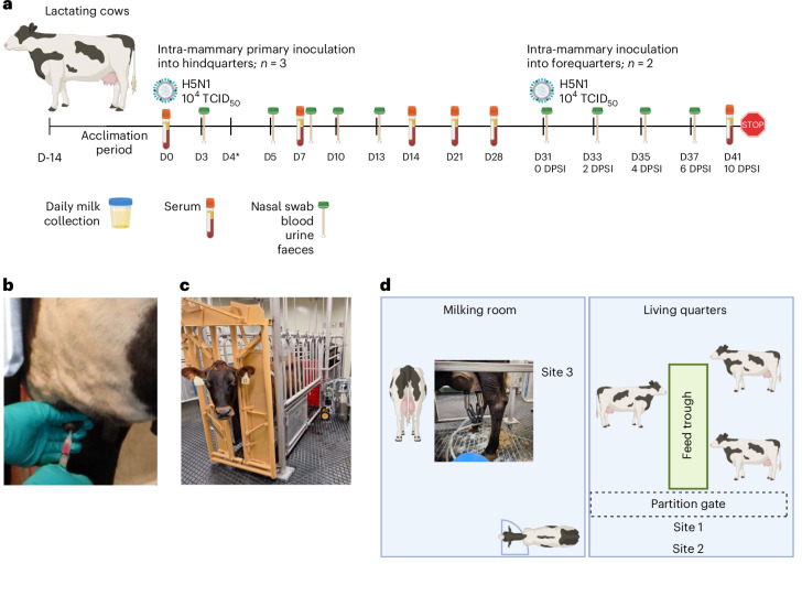 Infection of highly pathogenic avian influenza (HPAI) H5N1 clade 2.3.4.4b in dairy cows causes severe mastitis and milk production losses. Whether cows can develop protective immunity is unclear. Here we infected three lactating cows with HPAI H5N1 genotype B3.13 via the hindquarters of the udder to mimic intra-mammary infection. Inoculated cows displayed clinical responses consistent with affected dairy herds in the United States including virus shedding almost exclusively in inoculated hindquarters that peaked between Days 2-4 post inoculation and gradually declined by Day 21. Histologically, peak virus shedding in milk corresponded with severe acute necrotic mastitis in the inoculated hindquarters but not in the uninoculated forequarters. Two cows were reinfected with HPAI H5N1 virus at unaffected forequarters following resolution of infection. Secondary inoculation did not result in clinical manifestations or virus shedding in milk. Virus-neutralizing antibodies were detected at Day 14 post inoculation in milk with higher titres observed in the inoculated hindquarters relative to the forequarters. We also detected HPAI H5N1 viral RNA in air samples from animal rooms during routine husbandry activity. These data indicate that primary infection via intra-mammary inoculation can generate protective immunity against bovine HPAI H5N1 virus in dairy cows.