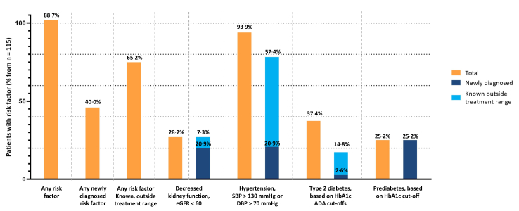 Findings: In total, 6380 patients (3802 via ten GPs and 2578 via five pharmacies) were invited for home-based albuminuria screening. The participation rate was 40·1% among patients invited via their GP (1524/3802), compared to 21·8% (562/2578) among those invited via their pharmacy (P < 0·001). In total, 8·7% of the GP participants had confirmed increased albuminuria (133/1524), compared to 6·0% of the pharmacy participants (34/562). Of the 115 GP participants with detected increased albuminuria who completed the elaborate screening, 102 (88·7%) were identified with one or more newly diagnosed CKD or cardiovascular risk factor(s) (n = 46, 40·0%), or with a known risk factor that was outside the target range for treatment (n = 75, 65·2%). Of the pharmacy participants with detected increased albuminuria completing the home-based screening, 26 completed the elaborate screening. Of those, 22 (84·6%) were identified with one or more newly diagnosed CKD or cardiovascular risk factor(s) (n = 6, 2·3%), or with a known risk factor that was outside the target range for treatment (n = 21, 80·8%).