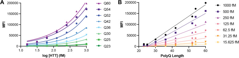 Huntington disease (HD) is a progressive and devastating neurodegenerative disease caused by expansion of a glutamine-coding CAG tract in the huntingtin (HTT) gene above a critical threshold of ~ 35 repeats resulting in expression of mutant HTT (mHTT). A promising treatment approach being tested in clinical trials is HTT lowering, which aims to reduce levels of the mHTT protein. Target engagement of these therapies in the brain are inferred using antibody-based assays that measure mHTT levels in the cerebrospinal fluid (CSF). These levels are typically reported as the absolute concentration of mHTT concentration, derived from a standard curve generated using a single protein standard. However, patient biofluids are a complex milieu containing different mHTT protein species, suggesting that absolute quantitation is challenging. As a result, a single recombinant protein standard may not be sufficient to interpret assay signal as molar mHTT concentration. In this study, we used immunoprecipitation and flow cytometry (IP-FCM) to investigate different factors that influence mHTT detection assay signal. Our results show that HTT protein fragmentation, protein-protein interactions, affinity tag positioning, oligomerization and polyglutamine tract length affect assay signal intensity. These findings indicate that absolute HTT quantitation in heterogeneous biological samples is not possible with current technologies using a single standard protein. We also explore the binding specificity of the MW1 anti-polyglutamine antibody, commonly used in these assays as a mHTT-selective reagent and demonstrate that mHTT binding is preferred but not specific. Furthermore, we find that MW1 depletion of mHTT for quantitation of wildtype HTT is not only incomplete, leaving residual mHTT, but also non-specific, resulting in pull down of some wildtype HTT protein. Based on these observations, we recommend that mHTT detection assays report only relative mHTT quantitation using normalized arbitrary units of assay signal intensity, rather than molar concentrations, in the assessment of central nervous system HTT lowering in ongoing clinical and preclinical studies. Further, we recommend that MW1-depletion not be used as a method for quantifying wildtype HTT protein and that detergent be consistently added to samples during testing.