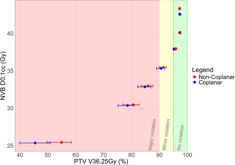 Conclusion: NVB sparing without compromising target coverage is feasible. No clinically relevant benefit was found for non-coplanar compared to coplanar NVB sparing plans, although overall statistically superior. Further sparing of the NVB comes at the cost of target coverage, for which a Pareto front could be used as a tool in clinical practise.