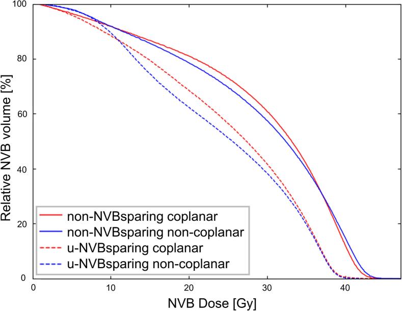 Results: u-NVBsparing compared to non-NVBsparing plans showed statistically significant median reductions in NVB D0.1 cc (38.9 vs 42.6 Gy for coplanar; 38.9 vs 43.3 Gy for non-coplanar) and Dmean (25.6 vs 30.0 Gy for coplanar; 24.7 vs 30.2 Gy for noncoplanar). Further lowering NVB D0.1 cc in c-NVBsparing plans clearly correlated to lower target coverage. Non-coplanar c-NVBsparing plans maintained significantly higher target coverages for similar NVB D0.1 cc values, compared to coplanar plans.