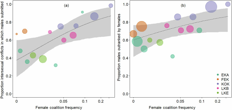 In mammals, female dominance over males is a rare phenomenon. However, recent findings indicate that even in species with sexual dimorphism biased towards males, females sometimes occupy high status. Here we test three main hypotheses explaining intersexual power relationships, namely the self-reinforcing effects of winning and losing conflicts, the strength of mate competition, and female coalition formation. We test these for bonobos (Pan paniscus), one of our closest living relatives, where females have high status relative to males despite male-biased size dimorphism. We compiled demographic and behavioral data of 30 years and 6 wild living communities. Our results only support predictions of the female coalition hypothesis. We found that females target males in 85% of their coalitions and that females occupy higher ranks compared to males when they form more frequent coalitions. This result indicates that female coalition formation is a behavioral tool for females to gain power over males.