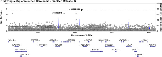 Methods: A GWAS on 376 cases of OTSCC was conducted using the FinnGen Data Freeze-12 dataset. The case-cohort included 205 males and 171 females. Cases with malignancies involving the base of the tongue or lingual tonsil were excluded from the case-cohort. Individuals with no recorded history of malignancy were used as controls (n = 407,067). A Phenome-wide association study (PheWAS) was performed for the lead variants to assess their co-associations with other cancers.