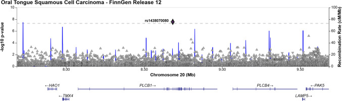 Results: GWAS analysis identified three genome-wide significant loci associated with OTSCC (p < 5 × 10-8), located at 5p15.33 (rs27067 near gene LINC01511), 10q24 (rs1007771191 near RPS3AP36), and 20p12.3 (rs1438070080 near PLCB1), respectively. PheWAS showed associations of rs27067 mainly with prostate cancer (OR = 1.06, p = 5.41 × 10-7), and seborrheic keratosis (OR = 1.11, p = 1.51 × 10-11). A co-directional effect with melanoma was also observed (OR = 0.93, p = 6.24 × 10-5).