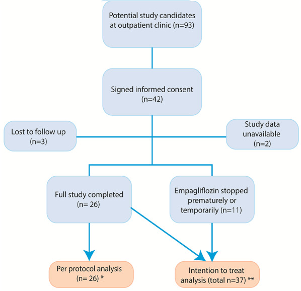 Methods: This is a pre-post intervention study in patients diagnosed with HFpEF who are eligible for treatment with empagliflozin. Microvascular function assessment using laser speckle contrast analysis of the dorsal forearm during iontophoresis of vasoactive stimuli (acetylcholine, insulin sodium nitroprusside) was performed at baseline and after 3 months of empagliflozin treatment (10 mg daily). The primary outcome was the difference in blood flow measured in the forearm microvasculature between baseline and at follow-up (cutaneous vascular conductance, CVC). Secondarily we investigated quality-of-life based on the EQ-5D-5 L questionnaire at baseline and follow-up.