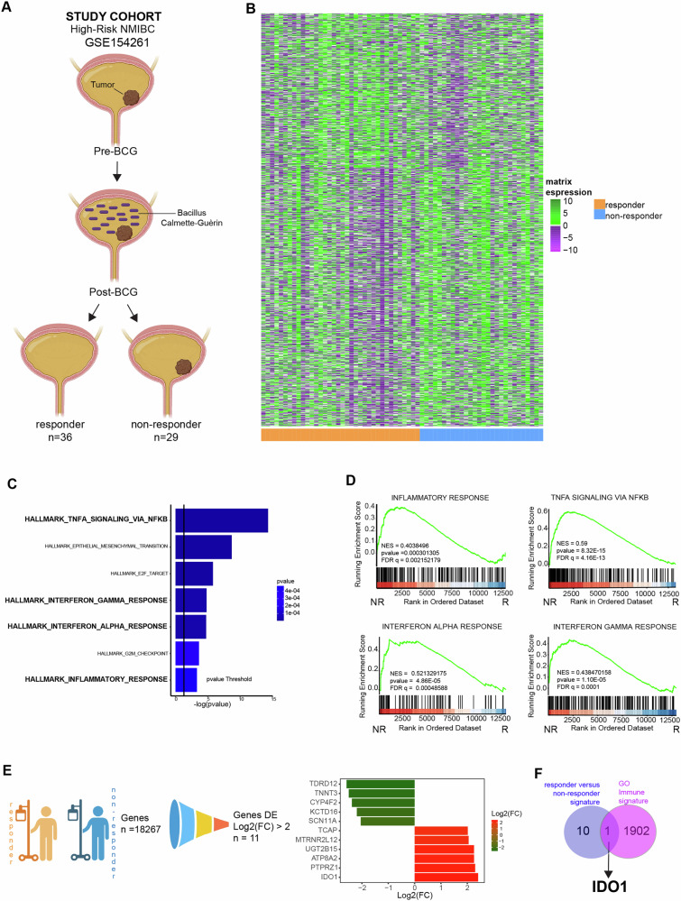 Recent studies have indicated a potential link between immune-related gene expression and Bacillus Calmette-Guèrin (BCG) treatment response in non-muscle-invasive bladder cancer (NMIBC) patients, however, prognostic gene signatures have not significantly improved risk stratification beyond clinical characteristics. To identify predictive biomarkers in T1 high-risk (HR) bladder cancer (BC) patients responding to BCG treatment, a gene signature was derived from a discovery cohort of 73 BCG-naïve patients, both responders and non-responders, using the publicly available dataset GSE1542618. Among the identified genes, Indoleamine 2,3-dioxygenase (IDO1), an immunosuppressive enzyme, emerged as a crucial determinant of treatment outcomes. The association between IDO1 expression and worse prognosis was subsequently validated in a cohort of 75 BC patients using formalin-fixed paraffin-embedded (FFPE) BC specimens collected prior BCG treatment. This research revealed significant insights into the mechanisms underlying unsatisfactory responses to BCG treatment in HR patients, posing IDO1 as a promising prognostic biomarker and therapeutic target for NMIBC.