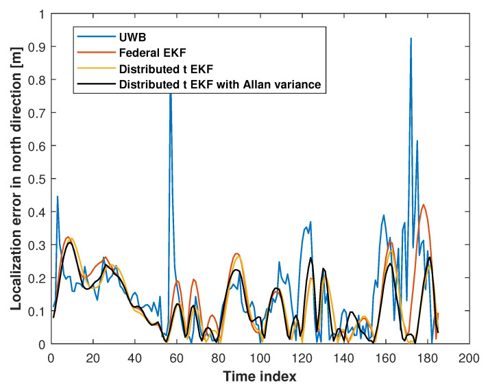 This study proposes an adaptive distributed Student's t extended Kalman filter (EKF) using Allan variance for ultrawide-band (UWB) localization. First of all, we model the state equation using the target's position and velocity in east and north directions and the measurement equation by using distance between the UWB base station (BS) and the target object. Then, the adaptive distributed filter employs a federation structure: A local t EKF is designed to estimate the target's position by fusing the distance between the UWB base station and the target object. The main filter fuses the local filter's outputs and computes the final output. For the local t EKF, in order to overcome the problem that noise in the Kalman method is assumed to be white noise and difficult to adapt to practical application environments, the t distribution is used to model noise. Meanwhile, Allan variance is calculated to assist the local filter, which improves the adaptive ability. Experimental results show that the proposed method effectively enhances navigation accuracy compared to the distributed EKF.
