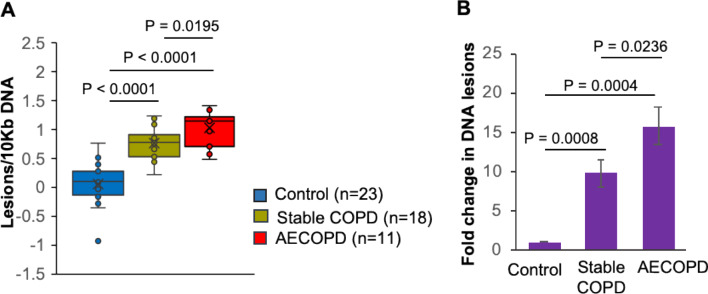 Results: The fold change in NEIL2 mRNA levels were lower in individuals with stable COPD and AECOPD than in controls (0.72 for COPD, p = 0.029; 0.407 for AECOPD, p < 0.001). The difference in NEIL2 mRNA expression between the stable COPD group and AECOPD group was also statistically significant (p < 0.001). The fold change in DNA lesions per 10 kb of DNA was greater in the stable COPD (9.38, p < 0.001) and AECOPD (15.81, p < 0.001) groups than in the control group. The difference in fold change was also greater in the AECOPD group versus stable COPD p < 0.024). Cytokine levels were not significantly different between the COPD groups. NEIL2 levels were correlated with plasma eosinophil levels in the stable COPD group (r = 0.737, p = 0.003).