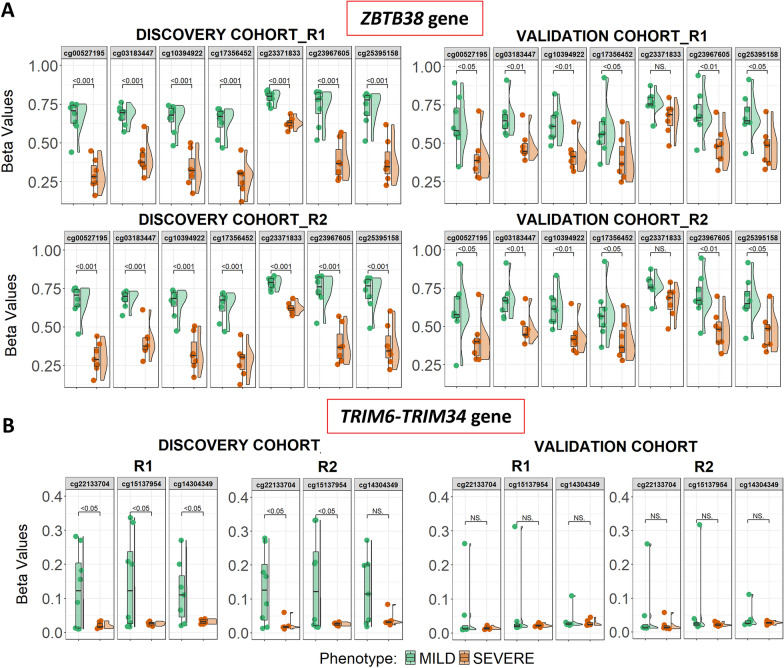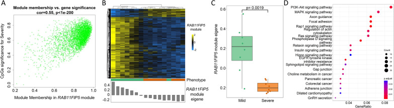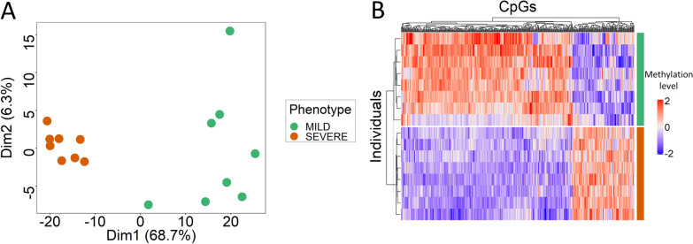 Results: A panel of differentially methylated positions (DMPs) distinguishing severe from mild to moderate symptoms in infants was identified. DMPs were determined using a threshold of an adjusted P-value (false discovery rate, FDR) < 0.01 and an absolute difference in DNA methylation (delta beta) > 0.10. Differentially methylated regions (DMRs) were identified in the ZBTB38 (implicated in asthma and pulmonary disease) and the TRIM6-TRM34 gene region (associated with viral infections). The differential DNA methylation of these genes was validated in an independent replication cohort. A weighted correlation network analysis emphasized the pivotal role of a module with RAB11FIP5 as the hub gene, known for its critical function in regulating viral infections.