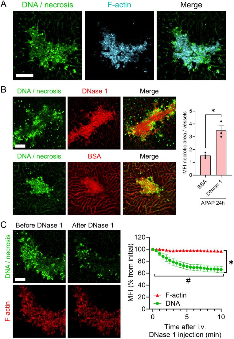 Necrotic cell death causes loss of membrane integrity, release of intracellular contents and deposition of necrotic cell debris. Effective clearance of this debris is crucial for resolving inflammation and promoting tissue recovery. While leukocyte phagocytosis plays a major role, soluble factors in the bloodstream also contribute to debris removal. Our study examined whether enzymatic degradation or disassembly of necrotic debris enhances clearance and improves outcomes in a mouse model of drug-induced liver injury. Using intravital microscopy and on-tissue spatially-resolved microproteomics, we demonstrated that necrotic debris is more complex than anticipated, containing DNA, filamentous actin, histones, complement C3, fibrin(ogen) and plasmin(ogen), among many other components. DNase 1 treatment facilitated recovery significantly by enhancing the clearance of DNA from necrotic areas, reducing circulating nucleosomes and actin, and lowering the associated inflammatory response. However, its effect on actin and other damage-associated molecular patterns in necrotic regions was limited. Treatment with short synthetic peptides, specifically 20-amino acid-long positively charged poly L-lysine (PLK) and negatively charged poly L-glutamic acid (PLE), which displace histones from debris in vitro, did not inhibit liver injury or promote recovery. Moreover, activating plasmin to disrupt fibrin encapsulation via tissue plasminogen activator (tPa) led to increased circulating actin levels and worsening of injury parameters. These findings suggest that fibrin encapsulation is important for containing necrotic debris and that enzymatic degradation of necrotic debris is a more effective strategy to enhance tissue recovery than targeting debris disassembly.