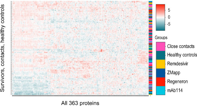 This study aimed to characterize ophthalmological manifestations and associated inflammatory markers in EVD survivors in post-treatment era. Case-control study of ophthalmological manifestations and plasma inflammatory biomarker profile in EVD survivors (n = 120) from the 2018-2020 outbreak in DRC, their gender- and age-matched close contacts (n = 120) and non-contact (healthy) controls (n = 120). Expressions of inflammatory markers were assessed using the Olink Explore 384 Assay and compared across study groups before and after stratification by treatment with monoclonal antibodies (mAB114, ZMapp, or Regeneron) or antiviral drug (Remdesivir). Protein profiling was carried out using the Olink statistical package. Mean age (years) was comparable among survivors (29.7 ± 10.6), close contacts (28.9 ± 11.1) and non-contact controls (29.3 ± 10.6) (p = 0.85). Mean time from disease onset to clinical assessment was 3.5 ± 0.5 (2.5-4.2) years in survivors. Optic neuropathy was more common in survivors (6.7%) than in close contacts (0.8%) and non-contacts (0.0%) (p = 0.003). Survivors with optic neuropathy had significantly worse visual acuity in both eyes than those without optic neuropathy (all p < 0.001). Clinical evidence of past anterior uveitis was observed in 2.5% of survivors, 2.9% of close contacts, and 1.8% of healthy controls (p = 0.86). Plasma circulating DGKZ, INFGR1, ERBB3, and MICA-MICB showed differential expression patterns between survivors and controls (all p < 0.05). However, no clear separation could be detected on principal component analysis of multiplexed proteomic data between survivor and control samples. Three proteins (ITM2A, CLEC4D, NCLN) were differentially expressed and related to optic neuropathy. The comparison between treatment groups revealed a trend toward lower protein inflammatory markers in survivors treated with Remdesivir than those treated with monoclonal antibodies. We conclude that in treated EVD survivors, optic neuropathy was the only neuro-ophthalmologic abnormality. Uveitis was far less frequent than reported in West African cohorts. ITM2A, CLEC4D, and NCLN were differentially expressed in EVD survivors with optic neuropathy long after the acute phase of the infection. The true meaning of these findings will need further investigations.