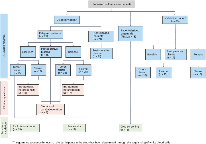 In stage 2-3 colon cancer (CC), postsurgery circulating tumor DNA (ctDNA) assessment is crucial for guiding adjuvant chemotherapy (ACT) decisions. While existing assays detect ctDNA and help identify high-risk persons with CC for recurrence, their limited sensitivity after surgery poses challenges in deciding on ACT. Additionally, a substantial portion of persons with CC fail to clear ctDNA after ACT, leading to recurrence. In this study, we performed whole-exome sequencing (WES) of ctDNA at different time points in participants with relapsed CC in two independent cohorts, alongside transcriptomic and proteomic analyses of metastases, to enhance comprehension of progression mechanisms. A plasma WES-based tumor-agnostic assay demonstrated higher sensitivity in detecting minimal residual disease (MRD) compared to current assays. Immune evasion appears to be the primary driver of progression in the localized CC setting, indicating the potential efficacy of immunotherapy for microsatellite stability in persons with CC. Organoid modeling further supports the promising potential of targeted therapy in eradicating MRD, surpassing conventional treatments.