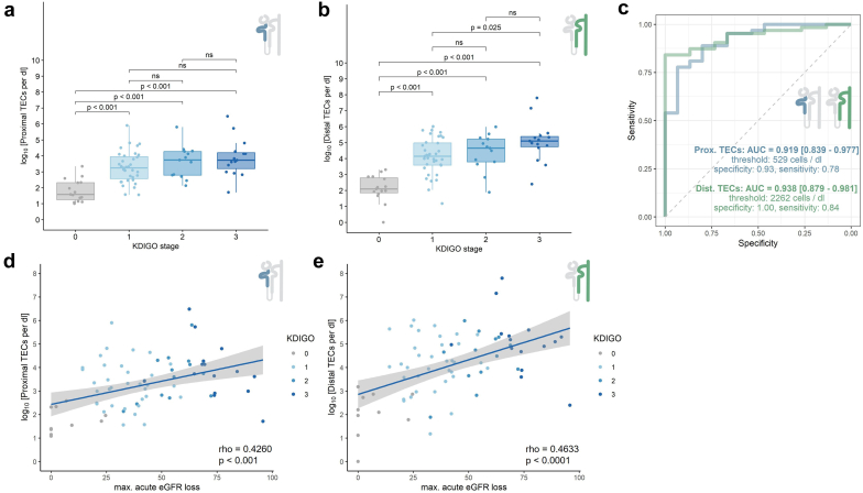 Results: Our findings demonstrated that CD10/CD13 and CD227/CD326 adequately identified PTECs and DTECs, respectively. Distal urinary TEC counts correlate with the severity of AKI based on Kidney Disease: Improving Global Outcomes (KDIGO) stage and acute estimated glomerular filtration rate (GFR) loss in 2 separate cohorts and can successfully discriminate AKI from healthy controls and glomerular disease.
