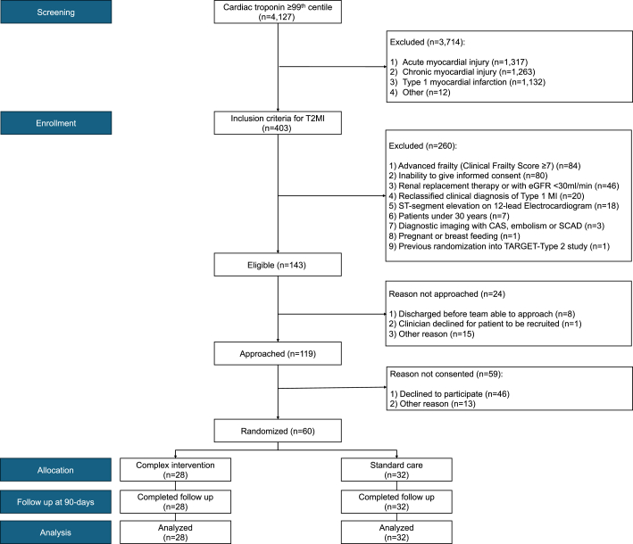 Conclusions: It is feasible to recruit and randomize patients with type 2 myocardial infarction to a complex intervention targeting coronary or structural heart disease. A multicenter trial with an optimized intervention is now required to inform practice.