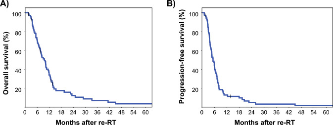 Results: Most patients were prescribed conventionally fractionated re-RT (84.5%) with 45 Gy in 1.8 Gy fractions, combined with temozolomide (TMZ, 49.3%) or lomustine (CCNU, 12.7%). Re-RT was completed as planned in 94.4% of patients. After a median follow-up of 73.8 months, 88.7% of patients had died. The median overall survival was 9.6 months, and the median progression-free survival was 5.3 months. Multivariate analysis identified residual contrast-enhancing tumor volume at re-RT (HR 1.040 per cm3, p < 0.001) as the single dominant predictor of overall survival.