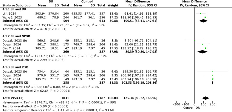 Results: A total of 38 studies were included in the systematic review and 27 studies were included in the meta-analysis. The mean differences in the NLR and PLR values were significantly different among the groups and were higher in the PDR group (0.68 (95%CI 0.42-0.95, p < 0.05) and 19.57 (95%CI 10.68-28.46, p < 0.05; respectively). These findings were followed by significant differences in SII value 202.53 (95% CI 196.19-208.86, p < 0.05). Moreover, the MLR values were not significantly different among the groups (p > 0.05).