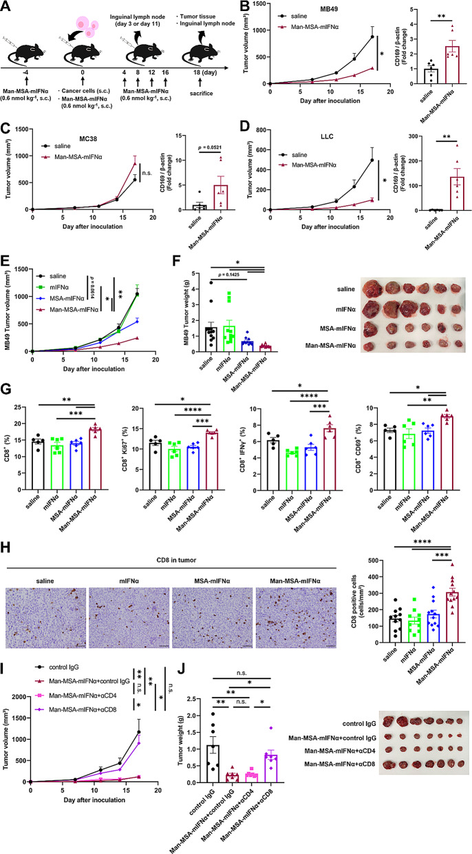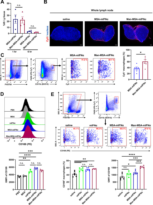 Conclusions: The present study successfully designed and developed Man-MSA-mIFNα, which efficiently induces the CD169+ phenotype in LN macrophages, contributing to the antitumor immunity. The findings suggest that our novel strategy targeting CD169⁺ macrophages could be a promising immunotherapy for cancer patients who are unresponsive to immune checkpoint inhibitors.