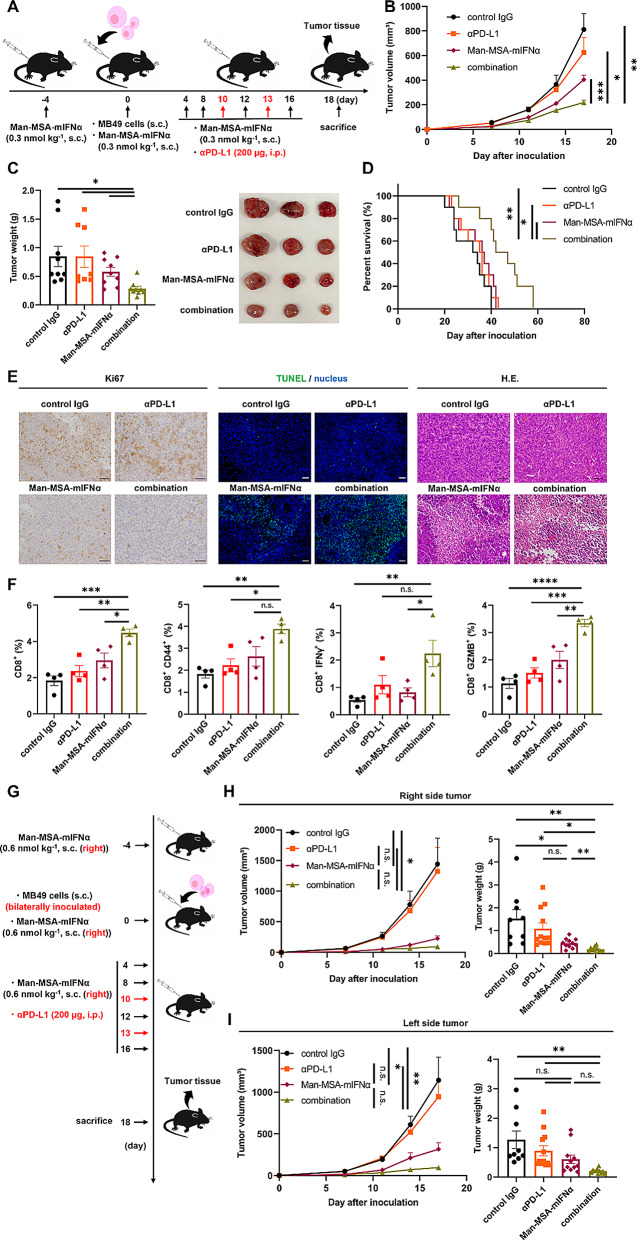 Results: Multiplex tissue imaging predicted close proximity of CD169+ macrophages and T cells and positive correlation between the number of CD169+ macrophages and T cells in neighborhoods in LNs of cancer patients. Physicochemical analyses showed that Man-MSA-mIFNα was formed from the fusion of the intact Man-MSA and mIFNα. Man-MSA-mIFNα efficiently induced the CD169+ phenotype of macrophages by its high LN distribution and macrophage-targeting capability, and significantly exerted antitumor activity through CD8+ T cell activation in the LNs, whereas its antitumor effects were canceled in CD169-DTR mice. Finally, combination therapy with PD-L1 blockade markedly suppressed tumor growth in MB49-bearing mice, which exhibit resistance to PD-L1 blockade monotherapy.