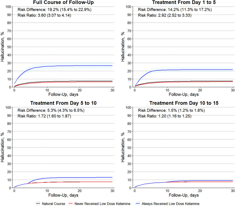 Results: We studied 7514 patients from June 2016 to April 2021. Of these, 625 patients (8%) received low-dose ketamine, beginning at a median of 0 (0-1) days from ICU admission and at a mean daily dose of 0.11 (0.08-0.15) mg/kg/h. Low-dose ketamine treated patients had a higher rate of hallucinations within 30 days of ICU admission (26% vs. 7%; p < 0.001) and the first episode of hallucination occurred earlier than in unexposed patient (2 [1-3] vs. 3 [1-7] days from ICU admission; p < 0.001). After adjustment for baseline and time-dependent confounders, low-dose ketamine was associated with a higher risk of hallucinations within 30 days (OR, 6.46 [95% CI 5.17-8.07]; p < 0.001). These findings were confirmed with parametric g-formulas.