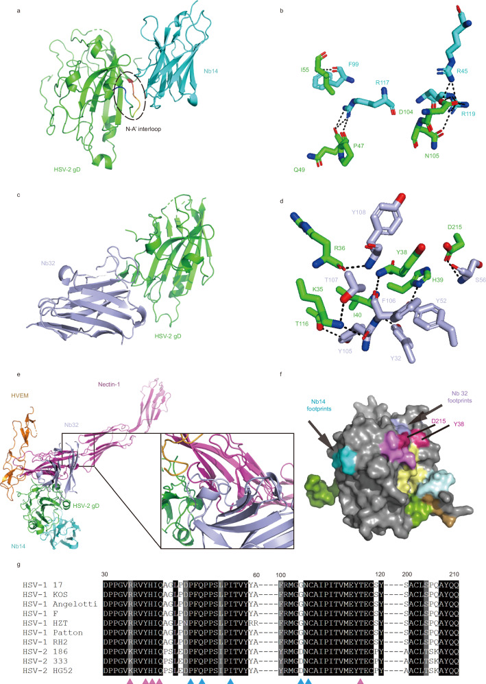 Herpes simplex virus (HSV) causes significant health burden worldwide. Currently used antiviral drugs are effective but resistance can occur. Here, we report two high-affinity neutralizing nanobodies, namely Nb14 and Nb32, that target non-overlapping epitopes in HSV gD. Nb14 binds a neutralization epitope located in the N-A' interloop, which prevents the interaction between gD and gH/gL during the second step of conformational changes during membrane fusion after virus attachment. The bispecific nanobody dimer (Nb14-32-Fc) exhibits high potency in vitro and in vivo. Mechanistically, Nb14-32-Fc neutralizes HSVs at both the pre-and post-attachment stages and prevents cell-to-cell spread in vitro. Administration of Nb14-32-Fc at low dosage of 1 mg/kg provides 100% protection in an HSV-1 infection male mouse model and an HSV-2 infection female mouse model. Our results demonstrate that Nb14-32-Fc could serve as a promising drug candidate for treatment of HSV infection, especially in the cases of antiviral drug resistance and severe herpes encephalitis.