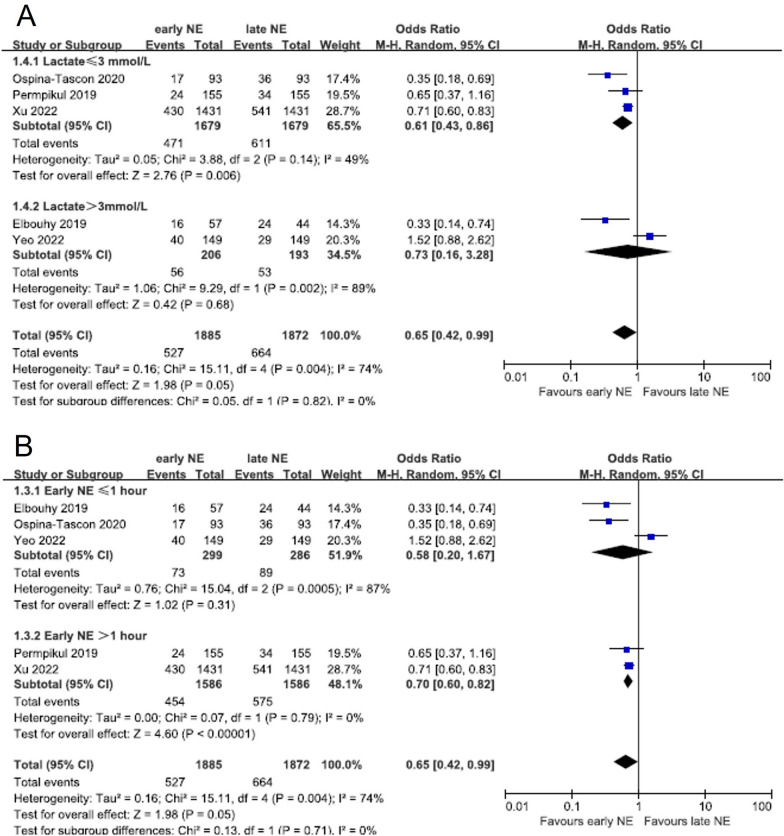Results: Ten studies (two RCT, three PSM and five observational studies) involving 4767 patients were included. Early norepinephrine significantly reduced mortality in RCT (OR 0.49, 95%CI 0.25-0.96; I2 = 45%, p = 0.04), pooled RCT and PSM (OR 0.65, 95%CI 0.42-0.99; I2 = 74%, p = 0.05), and observational studies (OR 0.71, 95%CI 0.54-0.94; I2 = 66%). The trial sequential analysis indicated more data are needed. Subgroup analyses showed reduced mortality with early norepinephrine when lactate was ≤ 3mmol/L and administered within 1 h. Secondary outcomes showed a reduced fluid volume at 6h (RCT + PSM: mean difference -502 mL, 95%CI -899 to -106; I2 = 91%, p = 0.01), faster MAP target achievement (RCT + PSM: mean difference -1.30h, 95%CI -1.75 to -0.85; I2 = 0%, p < 0.01), more mechanical ventilation-free days (RCT + PSM: mean difference 3.99 days, 95%CI 2.42-5.57; I2 = 32%, p < 0.01) and smaller cumulative norepinephrine dose (Observational: mean difference -3.44 mcg/kg, 95%CI -6.13 to -0.76; I2 = 0%, p = 0.01) in the early initiation group compare to the non-early initiation group.