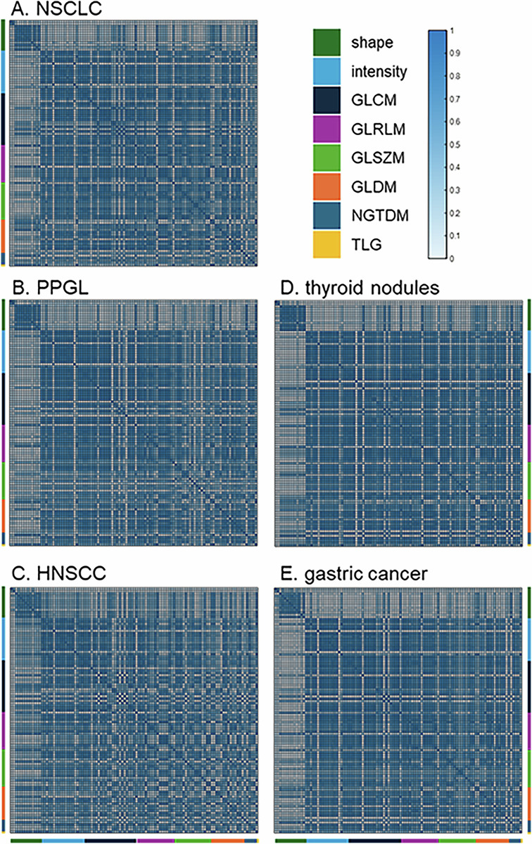 Methods: Five [18F]FDG-PET radiomic cohorts were analysed: non-small cell lung carcinomas (N = 35), pheochromocytomas and paragangliomas (N = 40), head and neck squamous cell carcinomas (N = 54), [18F]FDG-positive thyroid nodules with indeterminate cytology (N = 84), and gastric carcinomas (N = 206). Lesions were delineated, and 105 radiomic features were extracted using PyRradiomics. In every cohort, Spearman's rank correlation coefficient (ρ) matrices of features were calculated to determine which features showed (very) strong (ρ > 0.7 and ρ > 0.9) correlations with any other feature in all five cohorts. Cluster analysis of an averaged correlation matrix for all cohorts was performed at a threshold of ρ = 0.7 and ρ = 0.9. For each cluster, a representative, non-redundant feature was selected.