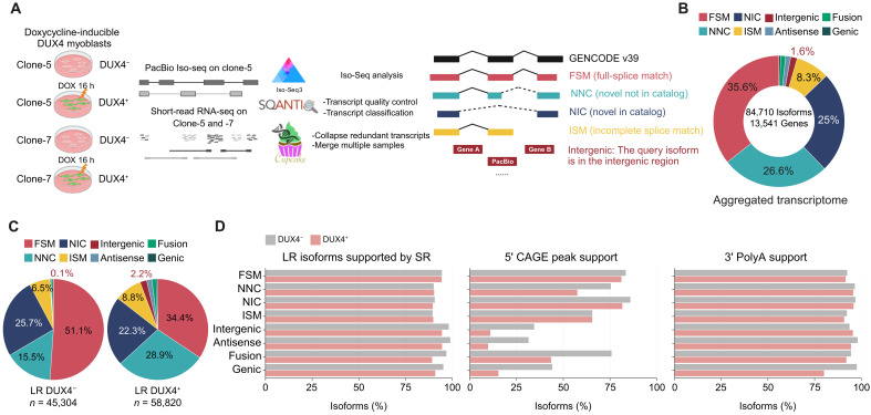 DUX4 regulates the expression of genic and nongenic elements and modulates chromatin accessibility during zygotic genome activation in cleavage stage embryos. Its misexpression in skeletal muscle causes facioscapulohumeral dystrophy (FSHD). By leveraging full-length RNA isoform sequencing with short-read RNA sequencing of DUX4-inducible myoblasts, we elucidate an isoform-resolved transcriptome featuring numerous unannotated isoforms from known loci and novel intergenic loci. While DUX4 activates similar programs in early embryos and FSHD muscle, the isoform usage of known DUX4 targets is notably distinct between the two contexts. DUX4 also activates hundreds of previously unannotated intergenic loci dominated by repetitive elements. The transcriptional and epigenetic profiles of these loci in myogenic and embryonic contexts indicate that the usage of DUX4-binding sites at these intergenic loci is influenced by the cellular environment. These findings demonstrate that DUX4 induces context-specific transcriptomic programs, enriching our understanding of DUX4-induced muscle pathology.