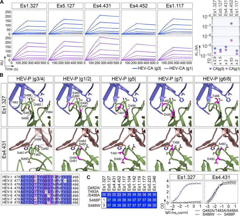 Antibodies targeting the hepatitis E virus (HEV) surface capsid protein (CA) are essential for infection control and resolution, yet their molecular and functional attributes remain largely elusive. We characterized 144 human HEV-CA-specific monoclonal antibodies cloned from the memory B cells of HEV-exposed individuals. Most human anti-CA antibodies cross-reacted with all HEV genotype variants, and a subset also recognized the zoonotic rat hepatitis E virus. HEV antibody repertoire was diverse and contained highly potent neutralizing antibodies binding to the CA protruding (P) domain. Structural analyses of CA protein complexed with three potent and broad HEV antibodies uncovered a neutralizing site located on monomeric P domain loops at the apex of the viral spike. These findings provide valuable insights into the protective humoral response to HEV and offer a framework for the rational design of HEV vaccines and immunotherapies.