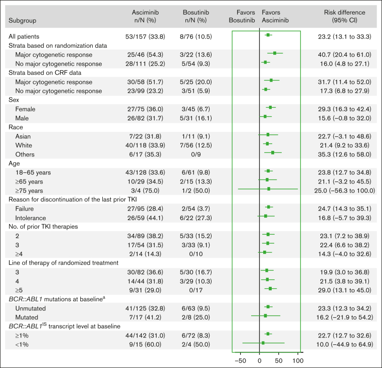 Conflict-of-interest disclosure: A.H. received institutional research support from Novartis, Bristol Myers Squibb, Incyte, and Pfizer; and personal fees from Novartis and Incyte. D.R. received personal fees from Novartis, Pfizer, and Incyte. C.B. received grants from Novartis during the conduct of the study. Y.M. received honoraria from Bristol Myers Squibb, Novartis, Pfizer, and Astellas. J.E.C. received grants and consulting fees from Novartis and Pfizer; and grants from Bristol Myers Squibb. T.P.H. received grants and honoraria for serving on advisory boards and for symposia from Novartis and grants from Bristol Myers Squibb. J.F.A. received honoraria from Incyte and Paladin; received research funding from Incyte; received honoraria for lecturing from Novartis, Pfizer, and R-Pharm; and is an National Institute for Health and Care Research (NIHR) emeritus senior investigator and acknowledges the support of the Imperial NIHR Biomedical Research Centre. E.L. received grants from Novartis; and personal fees and nonfinancial support from Novartis, Pfizer, and Bristol Myers Squibb. S.V. received personal fees from Novartis, AbbVie, Janssen, Sanofi, BIOCAD, Takeda, and AstraZeneca; and nonfinancial support from Pfizer, Novartis, AbbVie, Janssen, Sanofi, and BIOCAD. D.-W.K. received grants from Novartis, Bristol Myers Squibb, Pfizer, ILYANG, and Takeda. A.A. received honoraria from Novartis and Takeda. P.l.C. received speaker’s honoraria from Novartis, Incyte, Pfizer, and Bristol Myers Squibb. K.S. received research funding and honoraria for serving on advisory boards from Novartis. D.D.H.K. received grants, honoraria, and consulting fees from Novartis; grants from Bristol Myers Squibb; and honoraria from Pfizer and Paladin. S.S. received honoraria, grants, and personal fees from Novartis; and grants and personal fees from Bristol Myers Squibb and Incyte. L.C. received honoraria for advisory boards from Otsuka and Novartis; consultancy fees from Keros Therapeutics; and honoraria from Otsuka, Novartis, and Keros Therapeutics. V.G.-G. received grants, nonfinancial support, and honoraria from Novartis, Pfizer, Bristol Myers Squibb, and Incyte. S.K., N.E., and V.D. report being employees of Novartis. M.J.M. reports receiving personal fees from Bristol Myers Squibb, Takeda, and Pfizer. The remaining authors declare no competing financial interests.
