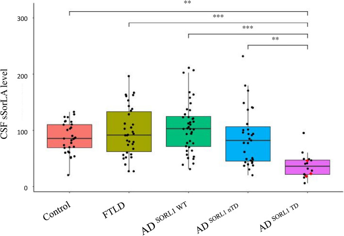 Results: We found significantly decreased levels of sSorLA in ADSORL1 TD, compared to all other groups. According to ROC curve analysis, levels of sSorLA showed good performances to distinguish ADSORL1 TD patients from other AD patients (AUC=0.89 [95%CI: 0.81-0.97]).