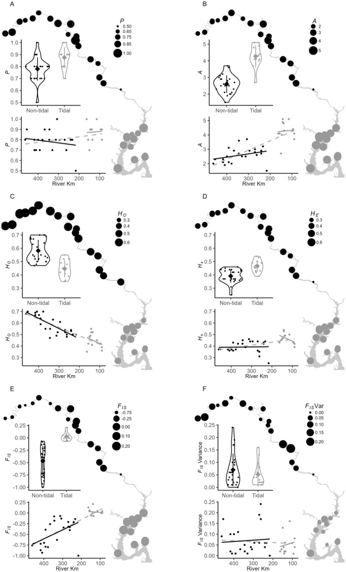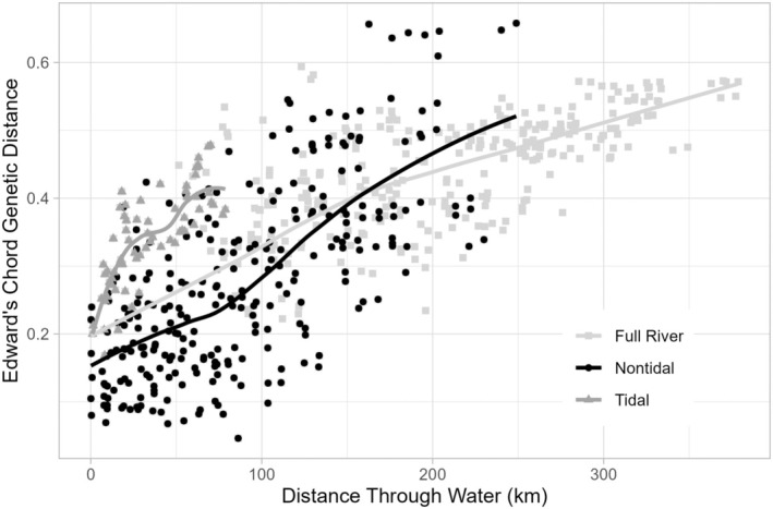 Genetic connectivity in rivers is generally high, and levels of genotypic and genetic diversity of riverine species are expected to accumulate in downstream locations. Genetic structure of marine and estuarine species is less predictable, even though hydrologic connectivity is also expected to be relatively high in those ecosystems. These observations have been generated across different species and locations such that our understanding of the effects of hydrologic connectivity in the same river, spanning tidal and nontidal habitats, remains incomplete. To control for species and location, we quantified diversity in 941 samples of Vallisneria americana Michx. (Hydrocharitaceae) collected from 36 sites along the species' entire distribution in the tidal and nontidal Potomac River of Maryland, Virginia, and the District of Columbia, USA. Using 10 microsatellite loci, we found 507 unique multilocus genotypes (MLGs) that were collapsed to 482 multilocus lineages (MLLs). Fifty-three MLLs were found multiple times across the riverscape, accounting for over 54% of the genotyped shoots. We found some evidence supporting connectivity throughout the river and stronger evidence that tidal regime drives genotypic and genetic structure within V. americana. Extensive clonality, including two MLLs spanning 230 and 152 km, limits diversity in the nontidal reaches and contrasts with very little evidence of clonal reproduction in tidal reaches. Genetic differentiation, structure, and pairwise relatedness of sampled shoots and MLLs also differed by tidal reach, with the nontidal Potomac having higher levels of relatedness, lower allelic diversity, and higher heterozygosity. The differences in spatial distribution of genetic diversity suggest very different outlooks for V. americana adaptation and acclimation to perturbations in tidal and nontidal regions of the Potomac, which lead to different recommendations for restoration of the same species in the same river.