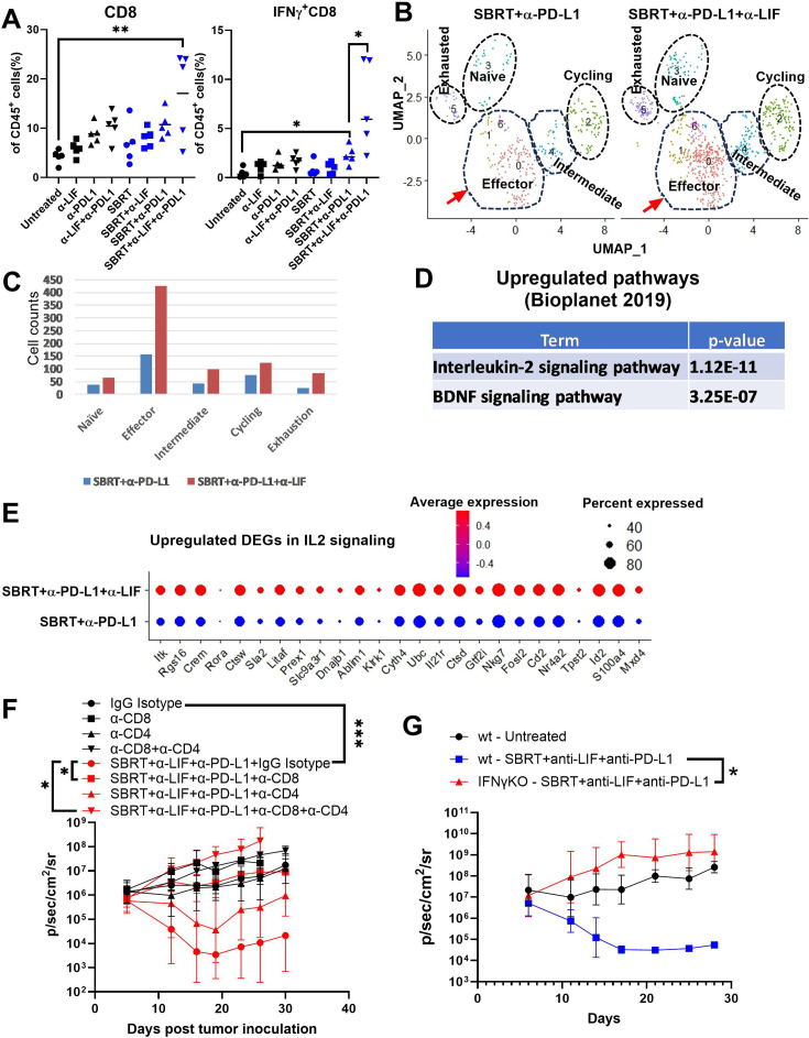 Results: We showed that simultaneous inhibition of LIF and PD-L1 significantly amplified the antitumor efficacy of SBRT, resulting in extended survival. The triple therapy (SBRT+anti-LIF+anti-PD-L1) generated an immunostimulatory tumor microenvironment, characterized by a proinflammatory shift in the cytokine/chemokine profile, increased infiltration of effector CD8+ T cells, and upregulated activation or maturation signals in tumor-infiltrating CD8+ T cells and macrophages. The beneficial effects of triple therapy were mostly abrogated by depletion of CD8+ T cells. In addition, triple therapy downregulated pathways related to tumor stemness, proliferation, and metabolism, and reduced EMT. Importantly, the combination of local SBRT treatment with systemic LIF and PD-L1 blockade resulted in long-term systemic antitumor memory.