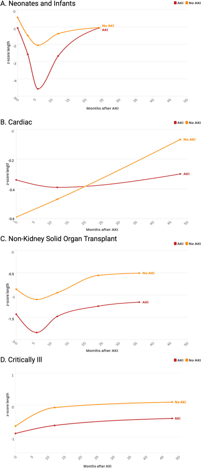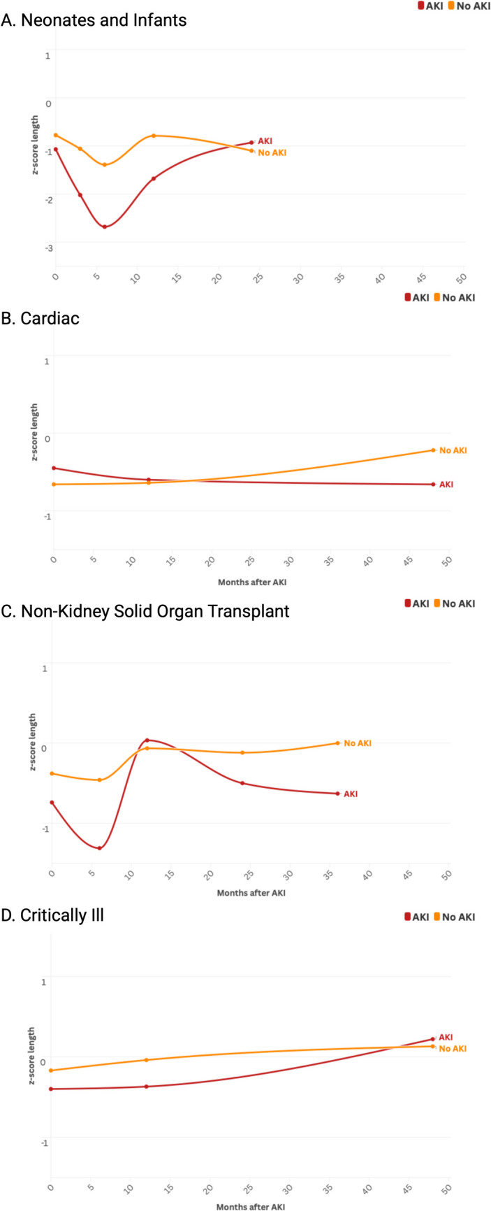 Results: We included 3,586 children from 17 existing cohorts of AKI in various populations, including infants, children with cardiac disease, solid organ transplant and critically ill children without cardiac disease with follow-up from 12 months to 11 years after AKI. At most distant follow-up, those with AKI had lower length z-score than those without AKI (mean difference -0.37 [95%CI -0.52, -0.22, p < 0.001]) and lower weight z-score (mean difference of -0.29 [95%CI -0.43, -0.15, p < 0.001]). This difference was most striking in infants, as those with AKI had impaired growth (both length z-score and weight z-score) after AKI compared to those without AKI.