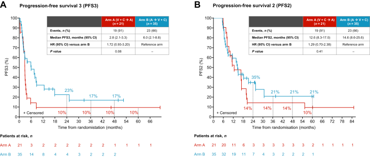 Patients and methods: The 1 : 1 randomised phase II ImmunoCobiVem trial compared-after a 3-month run-in phase with vemurafenib (VEM, 960 mg twice daily) and cobimetinib (COB, 60 mg daily days 21-28, q4w)-continuous VEM + COB until disease progression (PD1) and second-line atezolizumab (ATEZO, 1200 mg, q3w) in arm A versus early switch to ATEZO after run-in, followed by crossover to VEM + COB at PD1, in arm B. PFS from the start of run-in until PD1 was the primary endpoint (PFS1); secondary efficacy endpoints were OS, overall PFS (PFS2) and PFS3 (time from PD1 to PD after crossover, i.e. PD2) and best overall response rates (BORRs).