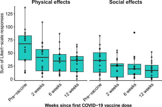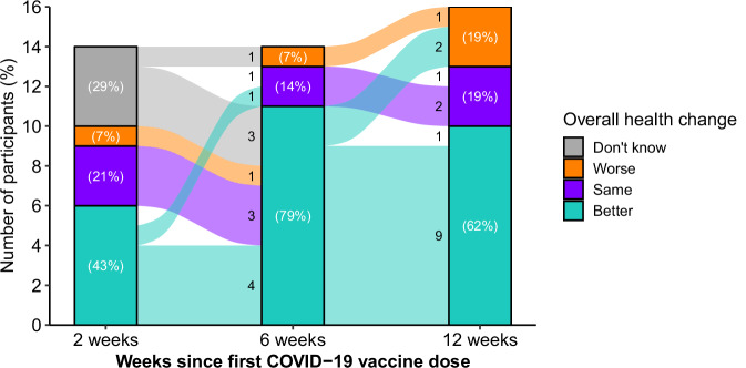 Results: At 12 weeks post-vaccination, self-reported improved health is seen in 10 out of 16 participants, 3 have no change, and 3 have worse health although 2 report transient improvement after vaccination. One participant reporting worse health was hospitalized twice with chest pain (after each dose). Symptom outcomes are most associated with plasma biosignatures. Higher baseline sIL-6R is associated with symptom improvement, and stably elevated levels of IFN-β and CNTF are associated with no improvement. Significant elevation in SARS-CoV-2-specific TCRs and spike protein-specific IgG are observed at 6 and 12 weeks after vaccination. No changes in reactivities are observed against herpes viruses and self-antigens.