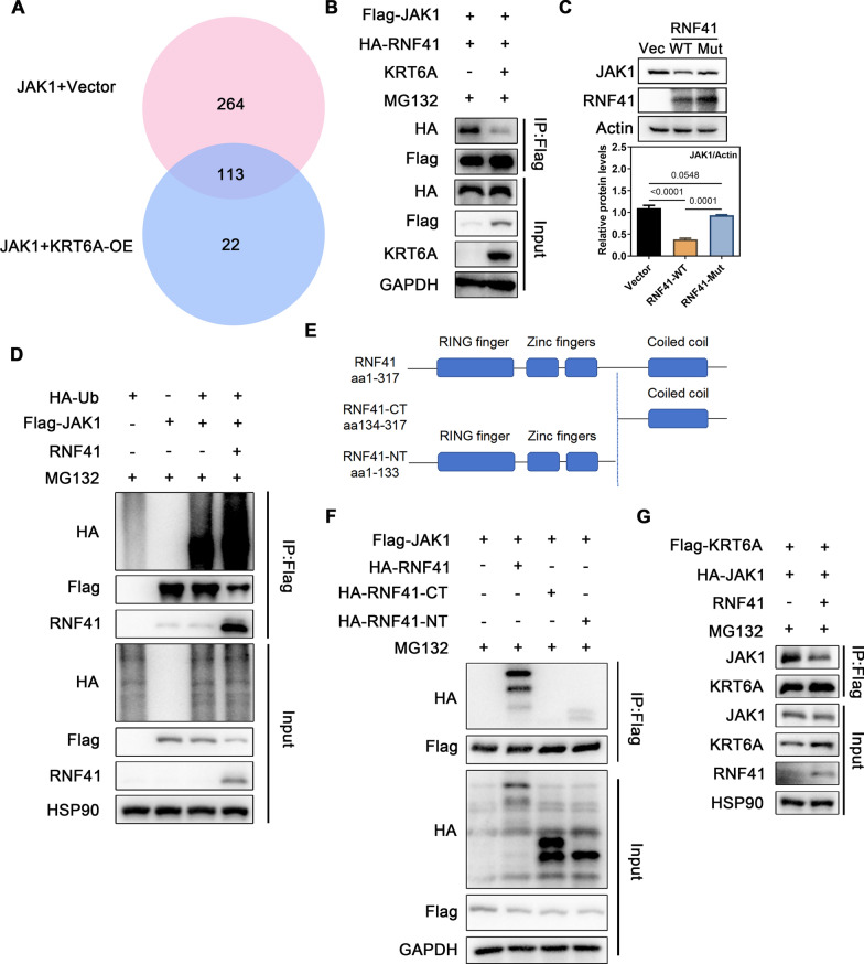 Results: KRT6A expression was elevated in lesional skin from patients and mouse models of rosacea and psoriasis. In mice with LL37-induced rosacea-like and imiquimod (IMQ)-induced psoriasis-like skin inflammation, KRT6A knockdown alleviated inflammation, whereas KRT6A overexpression exacerbated inflammatory responses. Mechanistically, KRT6A activated signal transducer and activator of transcription 3 (STAT3) and enhanced proinflammatory cytokine expression in keratinocytes by reducing Janus kinase 1 (JAK1) ubiquitination. This occurred through inhibition of ring finger protein 41 (RNF41)-mediated JAK1 binding.